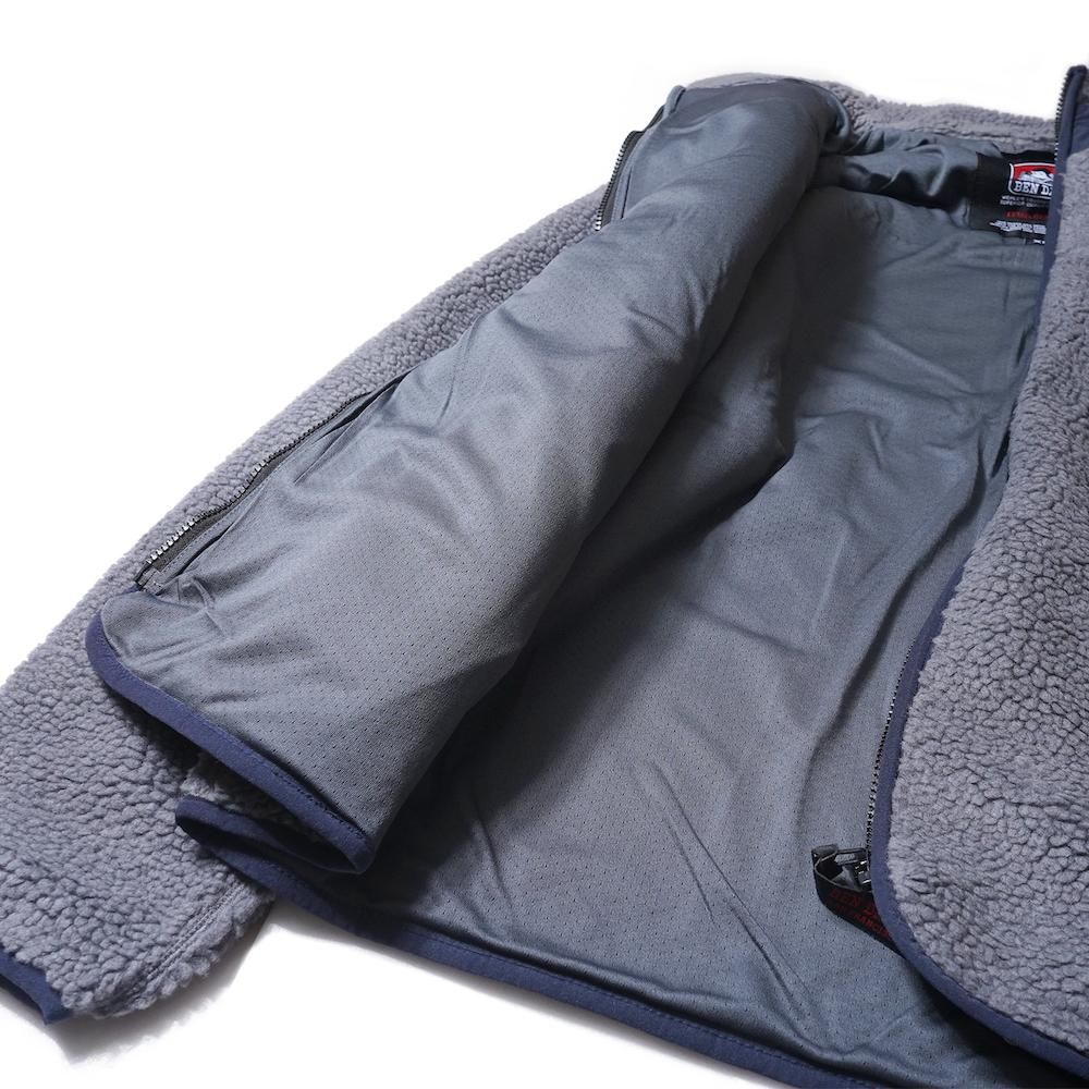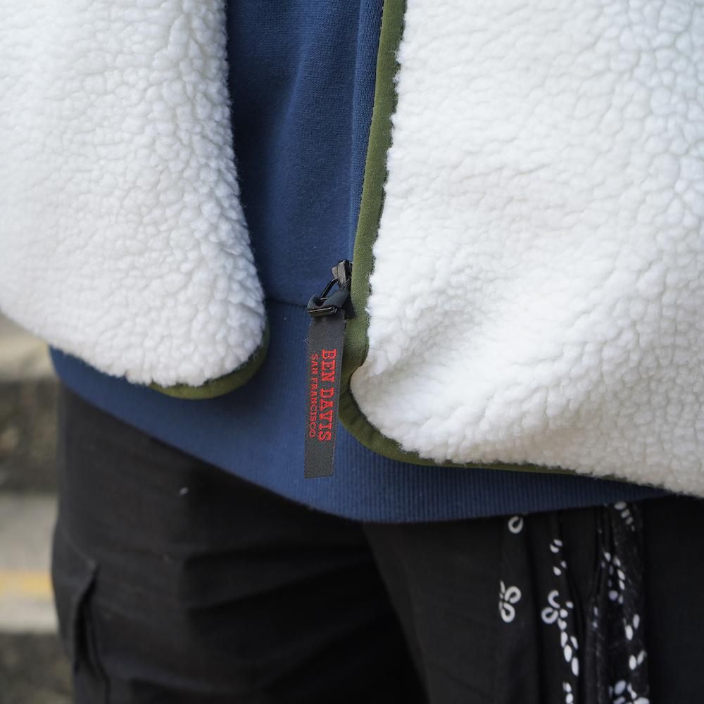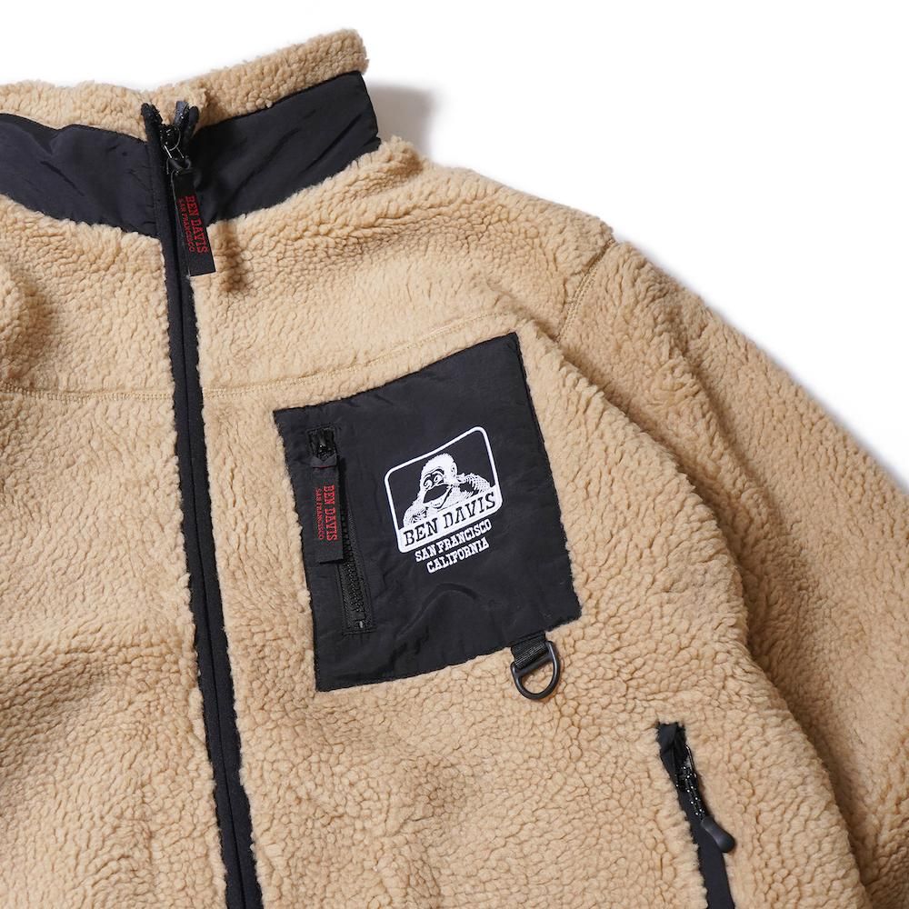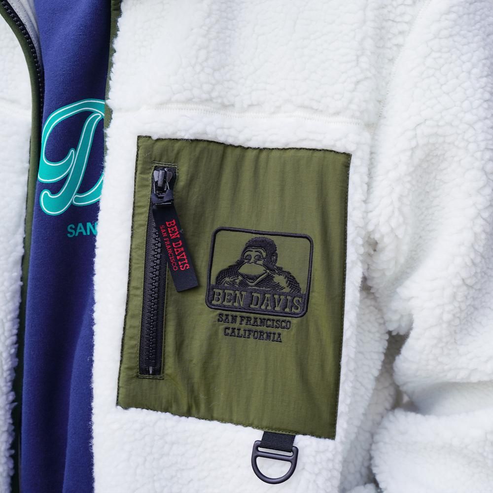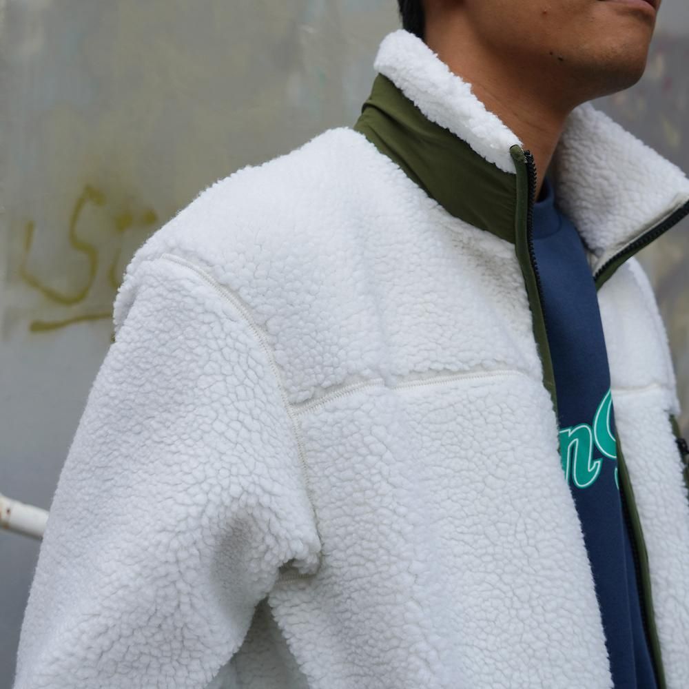 温かなボア素材にナイロンの異素材ポケットを配置。