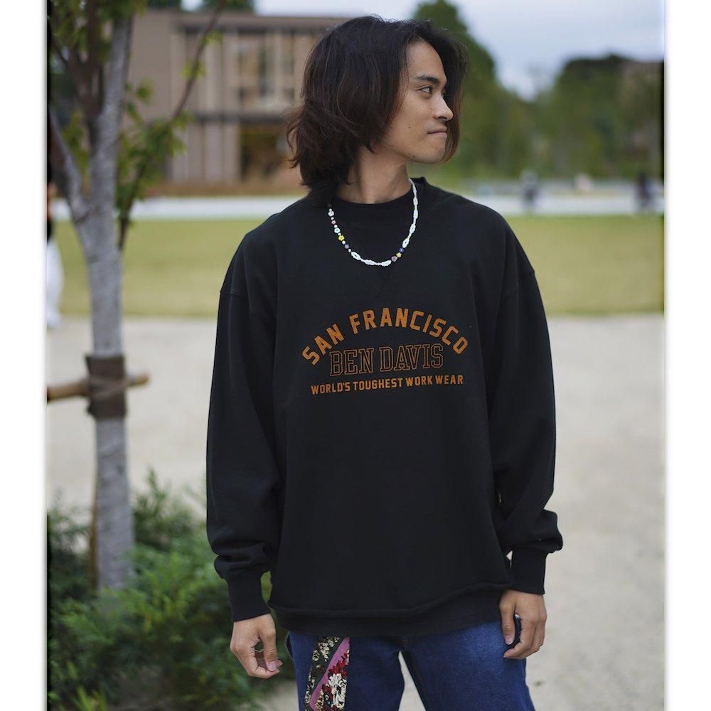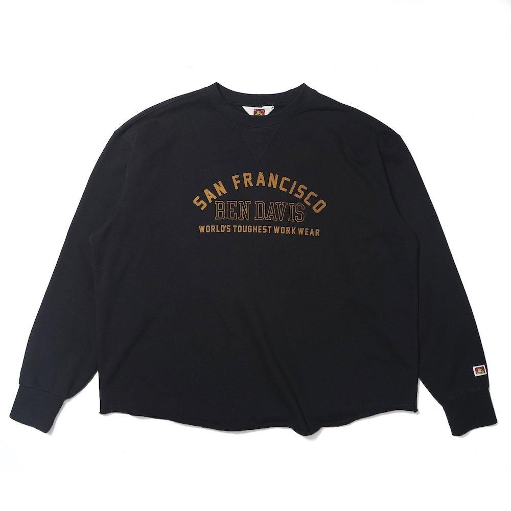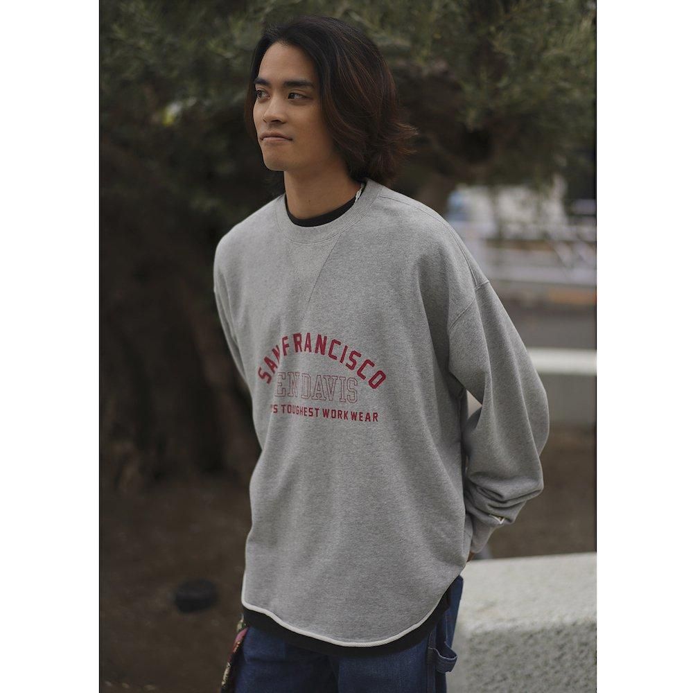 最新のデザインがプリントされたフロントと、裾部分は切りっぱなし仕様、ヴィンテージライクな両Vの汗止めが印象的です。